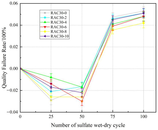 The mass loss rates of RAC with different NS doping during the DWC are shown in Figure 7. It can be seen that during the DWC, the mass of the concrete specimens of the six mixes increased and then decreased with the increase of NS admixture. In 25 repetitions of the DWC of sulfate, the pores inside the specimen are filled and the volume expands due to the gel-like object generated when the calcium substance in the cement interacts with the sulfate. With the increasing number of repetitions of DWC, the mass of RAC30-6 also increased gradually, and after 50 repetitions of DWC, the mass of RAC with NS added was larger than that of ordinary RAC, in which the mass of RAC30-6 was obviously larger than that of other specimens. This is because nanomaterials can fill microgaps and cracks in concrete more. As new products are deposited in the concrete, the quality of concrete of other nanomaterials decreases substantially. And due to the gradual loss of internal stress, it makes the width of internal cracks and side cracks of concrete specimen expand, and after the reaction deepens, the internal pressure reaches the extreme, the cracks penetrate the specimen, and the specimen reaches complete damage.
