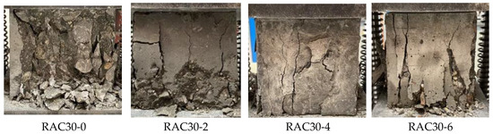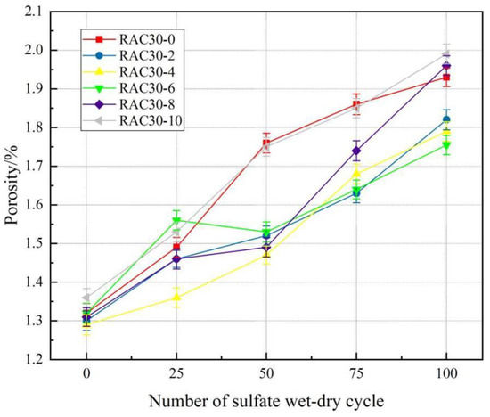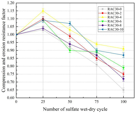 Figure 8 shows that the appearance of RAC with 4% NS doping is least affected by sulfate corrosion at 25 repetitions of DWC. The analysis of the curves shown in Figure 9 shows that the strength of RAC30-4 reaches its maximum value when the number of repetitions of DWC number 25, while the strength of concrete mixed with nanomaterials has been in a growing trend, so the effect of hydration on concrete is much greater than that of sulfate, and the effect of DWC on concrete forces still exists. The more repetitions of DWC, the more severe the corrosion of the concrete will be. This is mainly because recycled concrete is a material with pores which form tiny cracks during the hydration process, and RAC forms a large number of tiny cracks in the concrete after DWC. With the increase in the number of repetitions of DWC, internal cracks continue to expand, eventually affecting performance. Therefore, the compressive strength of concrete with different NS contents started to decrease with deepening corrosion, but the compressive strength of RAC30-4 decreased slowly, and the final strength of other concrete with added NS was much lower than that of RAC30-4. This is due to the fact that the new cement paste consisting of 4% NS and 30% recycled aggregates achieves an optimal combination of particles and thus a high filling density.