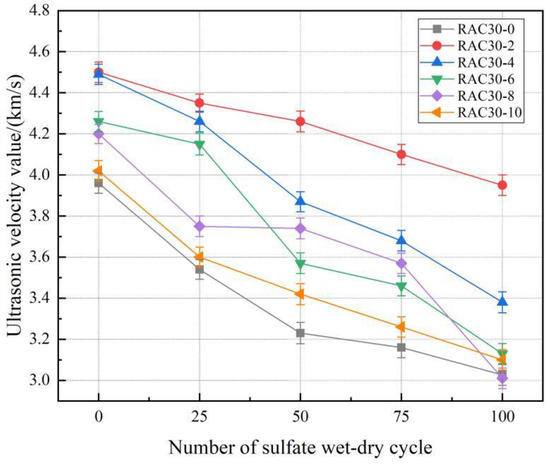 It can be seen from Figure 10 that the ultrasonic velocity values of concrete were tested under different number of repetitions of DWC and it was analyzed that the ultrasonic velocity values of concrete with different NS additions became smaller due to the increase in the number of repetitions of DWC, because the different NS admixtures dominated the effect on concrete and the increase in corrosion led to a large times of holes inside the concrete and its internal crack width became larger. The width of the internal cracks was increasing. The ultrasonic velocity of the concrete mixed with different NS showed a decreasing trend, but it was found that the ultrasonic velocity of RAC30-2 decreased relatively slowly compared to other specimens mixed with NS.