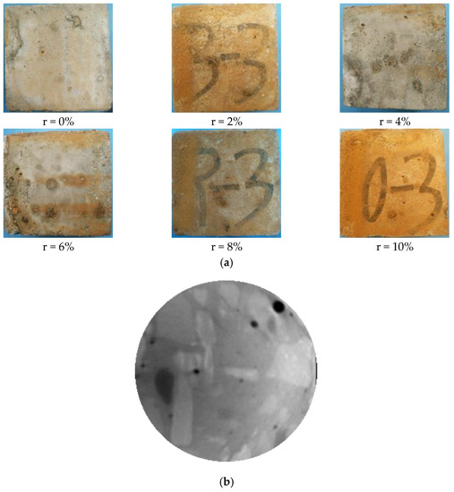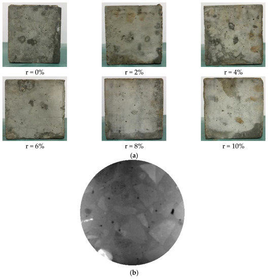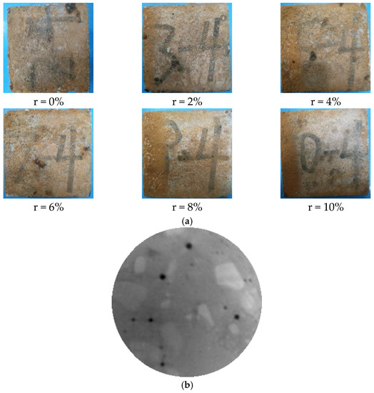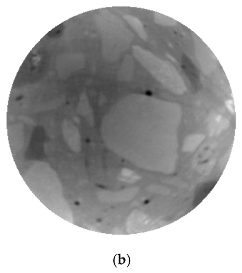 The tomograms of the concrete modified with different doped nanomaterials after 25 repetitions of DWC are shown in Figure 12a,b. As can be seen from the figure, the outer layer of cement mortar is still intact, the outer ring is obviously regular, and there are only a few holes in its surface. This is due to the mortar outside the concrete directly exposed to the external environment, the moisture in the air and carbon dioxide, and a small reaction, resulting in the hardening of cement mortar, thermal expansion and contraction of the test block surface shrinkage, resulting in holes. After 25 repetitions of DWC, the hydration reaction in the gel system still took precedence relative to sulfate attack. Because after 25 repetitions of DWC, the results showed that the strength of all specimens was enhanced, but NSRAC had higher strength than normal RAC. From this, it can be concluded that NS has a positive effect on improving the strength of concrete.