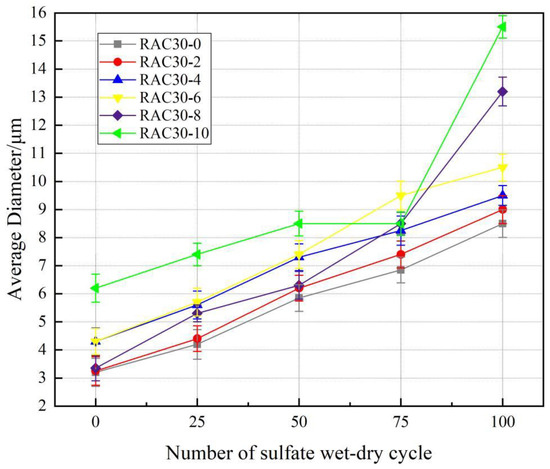Table 7 gives the comparative data of NS on the porosity of concrete with different admixtures, and then combined with Figure 16, it can be seen that the porosity corresponding to RAC30-4 are the lowest, and after different number of repetitions of DWC, the corrosion degree is gradually serious, and the porosity becomes larger accordingly. Therefore, it can also be concluded that the appropriate addition of nanomaterials can effectively improve the durability performance of concrete. The void diameters statistically derived during the 3D reconstruction are the values obtained by averaging a large number of irregularly shaped spheres, and the average diameters of NSRACs with different number of repetitions of DWC are compared in Table 8 and Figure 17.