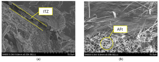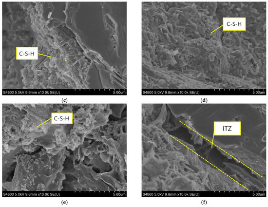 In terms of the interfacial structure of aggregate and mortar, it can be seen from Figure 18a,b that the addition of NS can make the interfacial structure of aggregate and mortar in RAC denser, and the hydrated calcium silicate gel in the ITZ is also more dense. In contrast, RAC without the addition of NS has a larger interfacial overrun zone and a loose and uncompact interfacial structure. The reason is that the addition of NS increases the content of reactive SiO2 in RAC. Due to the high volcanic ash activity and microfilling effect of SiO2, low-density continuous chain-like C-S-H gels can be generated by the secondary hydration reaction with calcium hydroxide, and these chain-like bodies are interconnected into a network structure to improve the interfacial overrun zone and make the interfacial structure denser.
