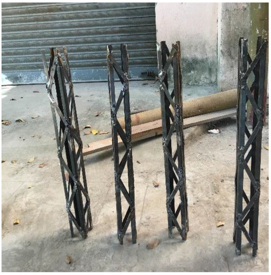 Four cold-formed angle sections were positioned longitudinally on each of the four corners of the laced, built-up composite short column. These sections were connected by lacings that were connected at a 45-degree angle in all directions. The columns were designed as per EN 1994-1-1 and Eurocode 4. The cold-formed angle sections were manufactured by pressing cold-formed steel plates under pressure. This steel core functions as reinforcement and is individually encased in NWC and LWC, with or without basalt fiber. The concrete-encased composite column is composed of both hardened concrete and a steel core.