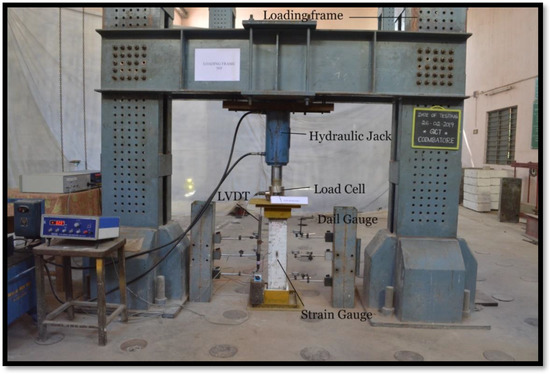 The columns were tested for axial cyclic loading in a loading frame using the following arrangements: The test setup for the specimens is shown in Figure 4. End steel plates were utilized at the top and bottom of the specimen to apply the load. The specimen’s verticality was preserved with due diligence. An LVDT was fastened vertically to the column end plate to measure the axial shortening. The linear and lateral strains were determined by installing strain gauges at the center point that were parallel and perpendicular to the column axis and connecting them to a 10-channel strain indicator. The load cell, which is placed over the column, is equipped with a digital load indication. The weight is applied using a hydraulic jack with a 50 T capacity that is driven by a battery pack. The test column is firmly fixed using the steel capping plates at the top and bottom. High-strength plaster and high-strength GFRP sheets are used to level the column’s top and bottom faces, ensuring even load distribution and preventing premature column crushing. For each load increment, the deformation and strain values are listed.