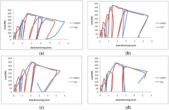 Experimentally, the axial shortening of the specimens was determined by vertically mounting an LVDT beneath the steel plate covering the column specimen (Figure 7). The axial deformation of columns LNA and LSA at failure was found to be 3.5 mm, whereas columns LNAF and LSAF reached an axial shortening of 4.5 mm at failure. After the ultimate load was reached, with further increments in loads, the column LNA sustained two more cycles, whereas other columns could sustain one cycle after the ultimate load. The last cycle was more pronounced with large deformation than the other cycles, even at small load increment levels, and finally failed with a rhombic-like load-deformation curve [15,40,41].