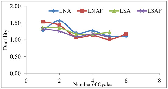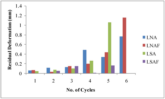The residual deformation is presented in Figure 8. The columns had very little residual deformation at the initial cycles of load increment and decrement. However, after the 3rd cycle, the column LNA had a sudden increase in residual deformation that decreased with a further increase in load cycles. The column LSA was found to have residual deformation with each increment in load cycles and lasted with a significant residual deformation only at the last cycle. The column LSAF was found to have the least residual deformation at all cycles. At the end of load cycles, the columns LNAF and LSAF are pronounced with more residual deformations. The effect of residual deformation comes into play with more resistance of the concrete to cracking and with better reinforcement.