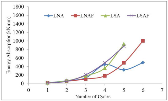 Figure 9 depicts the energy absorption of columns. The energy absorption capacity of the column LNA increased up to the 4th cycle and then suddenly decreased at the 5th cycle, after which it increased at the last cycle, whereas the other columns had increased energy absorption with the progression of load cycles. This increase is due to the confining effects of the laced composite structure, together with the effect of concrete. The cumulative energy absorption of column LNAF is 25% higher than that of column LNA, whereas column LSA has 5% more energy absorption than column LNA. Column LSAF was found to have 5.3% more energy absorption than LSA and 11.5% less than column LNAF.