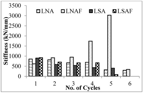 The stiffness degradation of columns of test series III under each cycle is shown in Figure 11. The stiffness behavior of the LNA column was high at the first cycle, and it started to decrease at a steady rate at each successive increment in cyclic loading. The LNAF column had increasing stiffness up to the 5th cycle, and it decreased at the 6th cycle. In the 5th cycle, there was an enormous increase in stiffness when compared with other cycles. The LSA and LSAF columns had decreasing stiffness at each successive cyclic load increment.