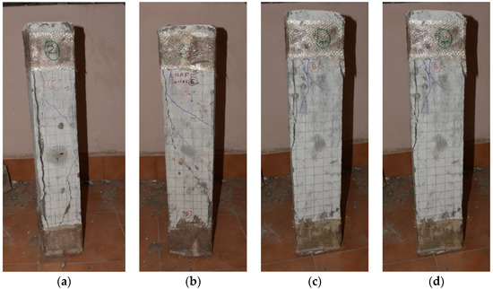 The columns were fixed at their positions and loaded with load increments and load reversals. Concrete compression or crushing predominated in the failure of the columns [42]. However, even after the appearance of a major crack, the column continued to withstand more loads. The role of the laced steel core plays a critical role here. Figure 12 shows the failure of the columns. The LNA and LSA columns were found to have vertical cracks along one corner. The LNAF column has a shear crack along one face of the column. The column LSAF was found to have some major cracks just below the GFRP lining. Almost all columns were found to have a minor crack that appeared at the end of the load increment in the second cycle. The first major crack appeared in the column LNA in the 4th cycle following a minor crack that developed at the bottom, but at the initiation of the 5th cycle, a major vertical crack suddenly started to appear at one side of the specimen just below the GFRP wrapping. It propagated at a faster rate, and the ultimate load was reached with subsequent load increments in the same cycle. Considering column LNAF, minor cracks were found surrounding the GFRP wrapping in all four corners right from the initiation of the 3rd cycle. Similar to column LNA, a minor crack suddenly appeared at the initiation of the 5th cycle, and it transformed into a shear crack even before the ultimate load. In column LSA, the corners of the column just below the GFRP wrapping started to chip off with the initiation of the 3rd cycle, and a sudden vertical crack developed at the top portion of the column at the load increment phase of the 4th cycle. The specimen reached the ultimate load, after which the crack propagated, resulting in final failure. The column LSAF failed with a large number of cracks, both major and minor, along with the four faces of the specimen. As with the column LSA, the column LSAF also reached its maximum capacity at the 4th cycle, and failure reached the 5th cycle. The only difference is that more minor cracks were found along the top face of the specimen LSAF.
