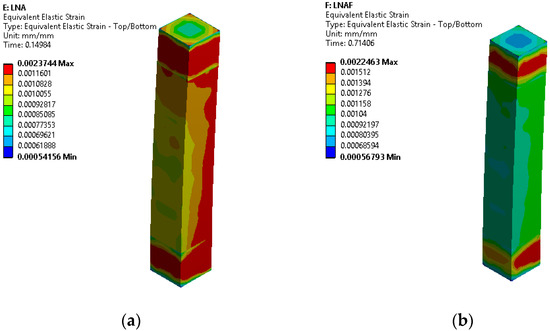 Finite element analysis is a numerical method of investigation used to solve problems in engineering that require unique analysis [43]. It is a powerful computational technique for solving structural problems with many variables [44]. This method of analysis is carried out using the solid modeling and analysis software ANSYS. Observing the strain behavior of the column at failure obtained from finite element analysis, as depicted in Figure 13, reveals that the columns LSA and LSAF were stressed up to 0.0025, whereas the columns LNA and LNAF were strained at 0.002.