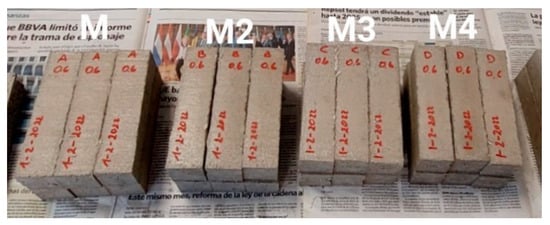 Four types of mortar mixtures were dosed in proportions of 1:3:0.6 of cement, sand and natural water, respectively, and the cement mortars were reinforced with PP fiber in quantities of 2, 3 and 4 kg/m3. Table 4 shows the proportions used for the specimens of 40 mm × 40 mm × 160 mm specimens prepared. The mortars were prepared mechanically, following the steps of the standard specified in UNE EN 196-1 []. The cement was mixed with the fibers, for 30 s so that it could be homogenized, and then the water was incorporated and mixed at a slow speed for 30 s. The sand was added in the following 30 s while continuing to mix at a slow speed. The speed was changed to a faster speed for 30 s, and the mixing was stopped after 90 s. During the first 30 s all the mortar that had adhered to the side walls and bottom of the container was removed using a rubber spatula to maintain an homogeneous mixture, and finally the mixing was continued at a faster speed for 60 s. The use of nanotechnology in the preparation of the specimens would improve the bond between the fibers and the mortar matrix [].