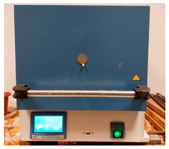 After 28 days, the specimens were moved from the curing chamber and dried at room temperature for 96 h. They were then weighed and placed in an R-8 L electric muffle furnace (Figure 2), which had a power of 1800 W, an accuracy of ±2 °C and reaches a maximum temperature capacity of 1100 °C. A heating rate of 15 °C/min was applied to the specimens until reaching temperatures of 50, 100, 200, 300, 400 and 500 °C, for one hour. Half of the specimens were kept under laboratory conditions (HR = 40%, T = 20 ± 2 °C) to be air cooled to room temperature. The rest were sharply cooled by submerging them in water until a temperature of 20 ± 3 °C was reached. After cooling, the mass values of the specimens were obtained, and they were tested for compression and flexure. The tests were carried out following the procedures described in norm UNE EN 196-1 []. The flexural strength tests were performed and then the compressive strength test was performed on the broken specimens.