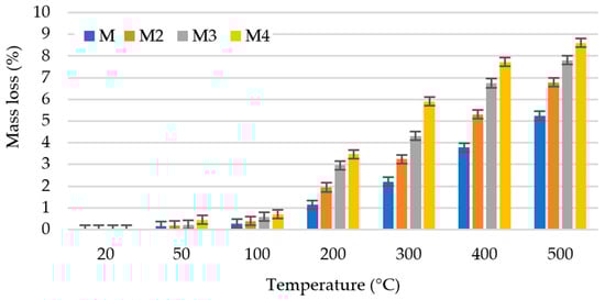 The densities of the processed mortars are shown in Table 4, where the increase in the amount of PP fibers produces a decrease in the mortar density. The results of the specimens reinforced with fibers and exposed to high temperatures were compared with the unreinforced specimens exposed to the same temperatures to obtain the mass loss, flexural strength and compressive strength. The masses of the specimens were obtained before and after being exposed to high temperatures, in addition to taking the masses after being cooled in air and water, and the differences between the masses before being exposed to temperature and after being cooled under their respective regimes were calculated for each temperature range, as presented in Figure 3 and Figure 4.