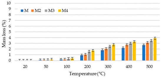 Both figures show that the higher the amount of PP fibers in the mortar and the exposure to higher temperatures, the higher the percentage of mass loss is, both for the air and water regimes, having percentage mass losses between 5 to 9% and 2 to 4%, respectively, when reaching a temperature of 500 °C. The mass loss for the air cooling regime is greater than that obtained for the water regime, due to the dehydration of Ca(OH)2, producing CaO in the mortar, which causes a loss of mass in the specimens, and adding to this the disintegration of the PP fibers when they reach their melting temperature of 170 °C.