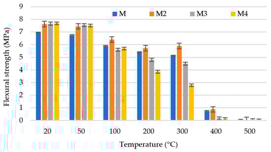 The specimens cooled under the air regime present a lower reduction in the flexural strength compared to the specimens cooled in water. The M2 specimens have higher flexural strength as temperatures increase up to 300 °C, regardless of the cooling regimes, and the strength value is higher compared to the M, M3 and M4 specimens, which is consistent with the previous research [,], where it is indicated that specimens reinforced with a fiber content of 2 kg/m3 perform better in flexural strength.
