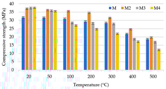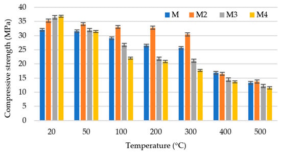 Figure 7 and Figure 8 show the variations of the compressive strength of the mortars in the different temperature ranges exposed.