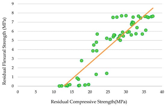 - There is a correlation between the residual flexural and compressive strengths regardless of the cooling regime, with a coefficient of determination as R2 = 0.82, which considers the relationship between the variables acceptable.