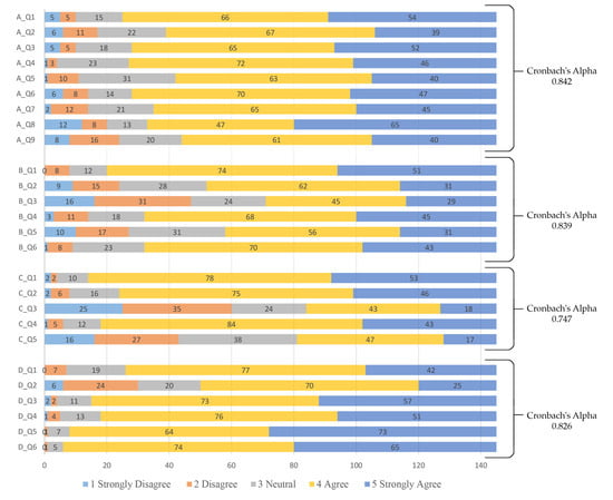The internal consistency of the scale was tested using Cronbach’s alpha (α) []. The test was selected as the relevant statistical literature recommends utilizing Cronbach’s alpha (α) for a research problem measuring attitude connected to a scale []. The test has been employed in exploring user assessments of the work environment [,]. Accordingly, the test was conducted for each group of independent variables, and the results show very strong internal consistency among scaled variables (see Figure 3) [].