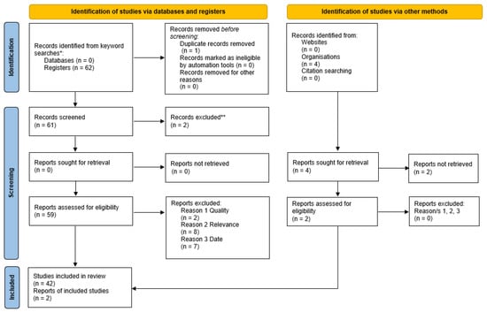 - Page, M.J.; Mckenzie, J.E.; Bossuyt, P.M.; Boutron, I.; Hoffmann, T.C.; Mulrow, C.D.; Shamseer, L.; Tetzlaff, J.M.; Akl, E.A.; Brennan, S.E.; et al. The PRISMA 2020 statement: An updated guideline for reporting systematic reviews. Syst. Rev. 2021, 10, 89. [Google Scholar] [CrossRef]