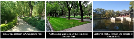 Linear spatial form—represented by Changpuhe Park. The park presents a linear spatial form, and the overall space has certain limitations, which makes the communication space of the elderly expand and the social distance narrow.