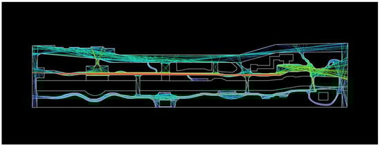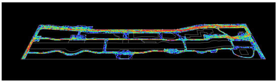 Three intersections of the road on the north side of the park and sidewalks are set as the pedestrian exit. According to this situation, the concentration of people flow was analyzed. The higher values measured represent warmer colors, and the lower values measured represent cooler colors, as shown in Figure 5.
