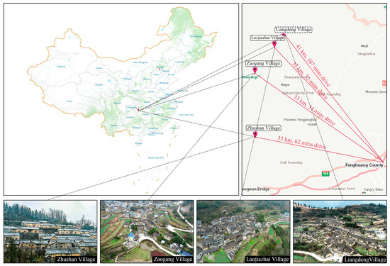 32]. To be specific, there are a considerable number of Miao traditional dwellings with a long history and different forms. The Miao traditional villages that have kept their traditional architecture and culture intact were selected as the main focus of this study. Four typical Miao traditional villages were selected as the study area, comprising Zhushan Village, Zhaogang Village, Laojiazhai Village, and Liangdeng Village in Phoenix County (