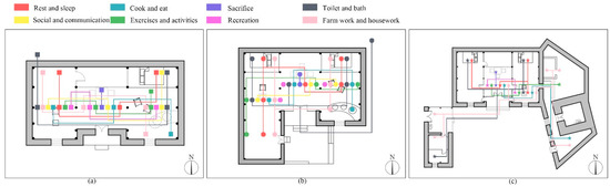 Figure 3 shows the behavior of the elderly in the traditional dwellings of the Miao nationality in western Hunan, with a, b, and c being traditional dwellings of the “I”, “L”, and “U” shapes, respectively. The daily productive activities of the middle-aged and elderly, mainly rest and sleep, cook and eat, sacrifice, social and communication, exercising and activities, recreation, farm work and housework, and toilet and bath, are spread throughout the rooms, suggesting that the elderly in the traditional dwellings of the Miao nationality in western Hunan use all the space and functions of the existing dwellings. Statistics show that rest and sleep are the most time-consuming behavioral patterns, accounting for 42% of daily life time; cook and eat are the next most time-consuming, accounting for 12% of daily life time; farm work and housework chores account for 8%; and social and communication, exercise and activities, and recreation together account for 35%.