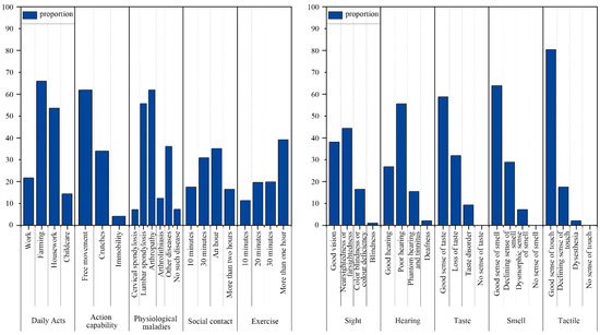 Figure 4 presents the results of the interviews on the physiological characteristics of the elderly in the traditional dwellings of the Miao nationality in western Hunan. For daily productive life behavior, the elderly who were engaged in work, farming, housework, and childcare accounted for 21.7%, 66%, 53.6%, and 13.6% of the total number of interviews, respectively. The analysis of the interviews indicated that most of the local elderly were subjected to physical ailments (e.g., curvature of the spine, shoulder pain, and gout in the joints), and 34% of them reported that they should rely on crutches to get around, closely correlated with their productive lifestyle behavior due to the constant farming work, coupled with the lack of infrastructure and accessibility facilities in the traditional dwellings. However, because of the relative isolation from transport and their daily work habits, local seniors spent more time on social activities and exercise, with over half of them spending more than an hour on social activities and over 30 min on exercise. For physical senses, the elderly had a more pronounced decline in visual and auditory functions, and over half of them considered that the decline in their visual and auditory senses affected their productive life activities. Furthermore, the elderly are exposed to smoke from cooking in fire pits and stoves for long periods, thus causing a significant loss of vision, visual fatigue, and eye diseases (e.g., glaucoma). Their sense of taste and smell are relatively good. Over 90% of the interviewees stated that these senses were still functioning normally and did not cause any inconvenience to their lives, probably due to their long-term stability. The sense of touch of the elderly interviewed was good, because they have lived in traditional dwellings for a long time without much contact with external electrical equipment, such that they have become more sensitive to the senses of cold and heat.