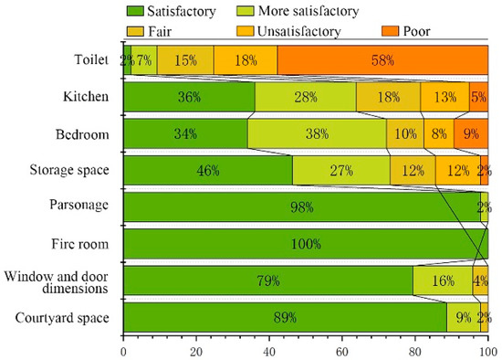 Figure 6 presents the results of interviews with elderly in the traditional dwellings of the Miao nationality in western Hunan about their living environment. Most people were satisfied with their living environment, with overall satisfaction levels of 100% for the courtyard space, door and window sizes, fire pit and hall, and 46%, 34%, and 36% for the storage space, bedroom, and kitchen, respectively. Furthermore, the overall satisfaction levels reached over 60%. However, 58% of the 97 elderly people interviewed felt that the toilets were poor, and 18% were dissatisfied with them. As revealed by the interviews, the elderly was generally satisfied with the environment they currently live in, whereas they were largely dissatisfied with the toilet space. The reason for this result is that most traditional dwellings do not have a separate toilet space, thus reducing convenience for the elderly. In addition, some of the elderly felt that the ground was only compacted with triple clay and lacked sufficient levelling, that the interior space lacked separation and was less private, and the staircase steps were poorly proportioned and affected travel. As indicated by the interviews, when suggestions were proposed for renovating the traditional dwellings of Miao nationality in western Hunan to address their dissatisfaction with the existing living environment, they were most concerned about the cost.