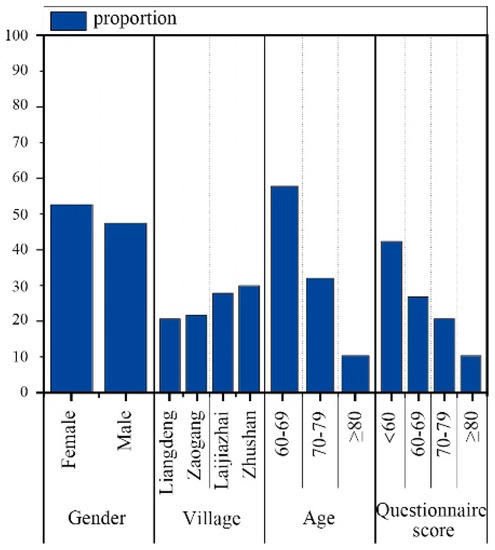 A total of 97 valid questionnaires out of the 110 questionnaires distributed were collected, with an efficiency rate of 88.2%. The number of respondents from Liangdeng, Zaogang, Laojiazhai, and Zhushan villages reached 20, 21, 27, and 29, respectively, as indicated by the 97 validly collected questionnaires. Respondents received and answered the questionnaire anonymously, and we ensured that the data and privacy of its content were protected and limited to the use of this study for academic research and not for other purposes. The content of the questionnaire follows the Declaration of Helsinki and is formally approved in terms of ethics and morality. To be specific, 51 (52.6%) were female respondents, and 46 (47.4%) were male respondents; 56 (57.7%) were aged 60–69 years, 31 (32.0%) were aged 70–79 years, and 10 (10.3%) were aged 80 years or above. The respondents’ scores on the SF-36 Health Assessment Scale suggested that 41 (42.3%) scored below 60, 26 (26.8%) scored 60–69, 20 (20.6%) scored 70–79, and 10 (10.3%) scored 80 or above (
