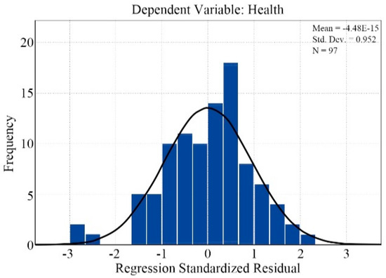 The nine independent variables of gender, age, education level, number of permanent household residents, income, daily behavior, traditional dwellings, infrastructure, and natural environment were investigated using SPSS together with the dependent variable of health status in a linear regression. A Durbin–Watson value of 1.608 was achieved, with Durbin–Watson values from 0 to 4 and closer to 2, as indicated by the results of the Durbin–Watson test (
