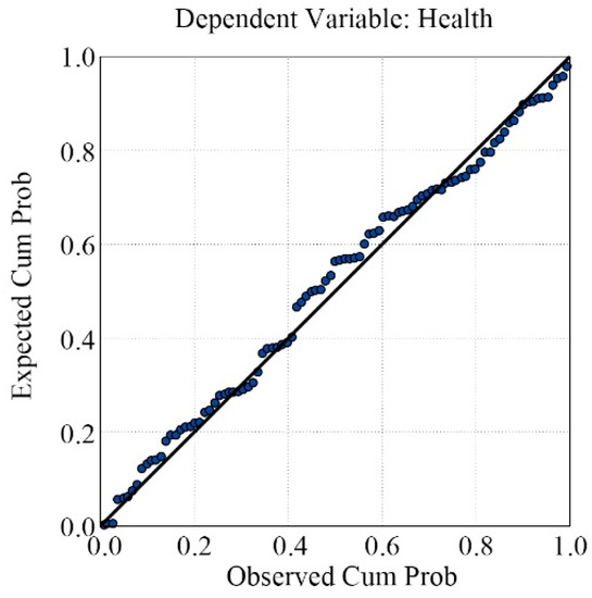 p-value was 0.000, less than 0.001, suggesting that the model passed the F-test, and the model showed a linear relationship. Moreover, the statistical significance of the model developed in this study revealed that the inclusion of independent variables can be conducive to predicting the dependent variable compared with the null model, or the model outperformed the null model, suggesting that at least one of the nine independent variables in this study can theoretically affect the health status.
