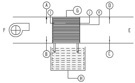 Figure 1. Schematic view. A, D: Thermocouples at inlet, on plates, and at outlet to note down the temperatures. B, C: Hygrometer at air entry and exit to note the relative humidity. F: Process air inlet through the exhaust fan. E: Dehumidified cool air outlet. G: Desiccant-coated heat exchanger. H: Two tanks placed opposite to each other. One where fluid is sent to the system and in the other, the outlet fluid is collected. I–K: Thermocouple to measure temperatures at different locations.