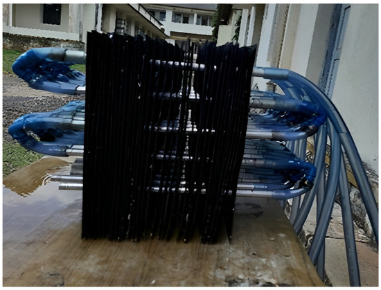 The experimental setup consisted of a desiccant-coated heat exchanger placed in a wooden duct. Figure 1 shows the schematic view of the system before conditioned air was blown over the desiccant-coated heat exchanger. DBT (dry bulb temperature) and RH (relative humidity) values before and after the heat exchanger were recorded by the thermocouples and hygrometers and air velocities were recorded by the anemometer. Figure 2 shows the individual desiccant-coated heat exchanger. It was fabricated using aluminum sheets with a thickness of 1 mm each. Holes were drilled at uniform distances within the plates and were connected by aluminum pipes. Hose and PVC elbows were used as connecting joints for the pipe. The set of pipes was connected to a single header for the nanofluid inlet and was similarly single at the exit. The heat exchanger was coated with the desiccant consisting of activated carbon and cocopeat with epoxy as the binder. The plates were placed at a distance of 0.7 cm from each other. Initially, the air was blown over the desiccant-coated heat exchanger and bare water was circulated along the pipes. When air interacted with the desiccant, dehumidification occurred and exit DBT and RH were reduced, which were recorded by the relevant instruments. The heat of condensation was absorbed by the water by which the exit water temperature increases. Air velocities and water flow rates were varied to study the influence of these operating parameters on the dehumidification performance. Later, instead of bare water, a mixture of water with cerium oxide nanoparticles was used as the cooling media. In order to ensure uniform distribution and to prevent agglomeration, the solution was sonicated using an ultrasonic sonicator for 2 h. Using this solution as the cooling media, the experiments were repeated and their effect on the dehumidification performance was studied. Table 1 shows the details of the tools and instruments used during the experiment. The complete matrix of the experimentation is shown in Table 2.