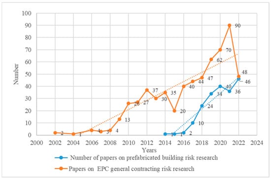 17]. For the owner, their responsibility is reduced to a certain extent. However, for the general contractor, the supervision and control authority of the project is increased, and the risk is increased. If the risk cannot be effectively controlled, it will lead to significant losses for the project. Thus, risk management is especially important for the general contractor. Reviewing the previous literature research data, we found that there are some gaps: (1) China’s research on prefabricated buildings risks and construction project risks under the EPC general contracting mode is increasing year by year, as shown in