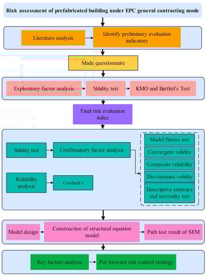 This study aimed to combine the domestic and foreign research on the risk of each stage of prefabricated buildings under the EPC general contracting mode, investigate and select risk assessment indicators, and analyze them: (1) We developed a risk evaluation index for prefabricated buildings under the EPC general contracting mode and established an evaluation index system. (2) We established a structural equation model (SEM) of prefabricated building risk under the EPC general contracting mode to determine the focus of risk control and guide project implementers to make better decisions. This study considered the complexity and interactivity of risk factors in each stage of prefabricated buildings. The SEM method not only verifies the rationality of each dimension index but also measures the degree of fitting of the overall model, making the evaluation results more scientific. This method overcame the limitations of the scientific evaluation of the risk of prefabricated buildings under the EPC general contracting mode in China. This technical method of diversified statistics can help general contractors to seek effective risk control paths.