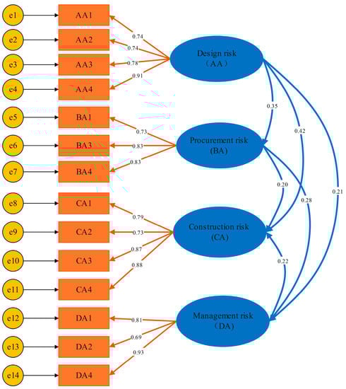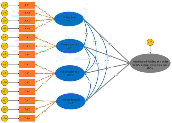 The degree of influence of fourteen risk measurement indices of prefabricated buildings under the EPC general contracting mode was analyzed from four perspectives: design risk, procurement risk, construction risk and management risk. The greater the standardized direct path coefficient, the greater the influence of the risk factor. The final SEM model showed that based on the β values, construction risk (CA) and design risk (AA) were the two key factors affecting the risk of prefabricated buildings under the EPC general contracting mode. Their β values were 0.350 and 0.263, respectively. The second-level indicators involved in the construction risk (CA) were the nonstandard stacking and protection of field materials (CA3; 0.87) and the insufficient technical level of hoisting operation (CA4; 0.88). The most important secondary indicator involved in design risk (AA) was the lack of integrated design experience of designers (CA1; 0.91).