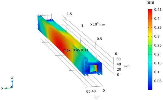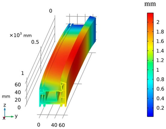 Figure 6b. The profile was fixed at both ends using the ‘Rigid Connector’ bounding condition in a flexible formulation. At one end, movements along the x-, y-, and z-axes as well as rotation around the x and y axes were restrained, and at the other end, movements along the y and z axes and rotation around the x and y axes were restrained. Such attachment is more reflective of the real working conditions of the profile in the window system than full hinge support, because in the corners of the window frame elements of the profile are rigidly connected by welding [