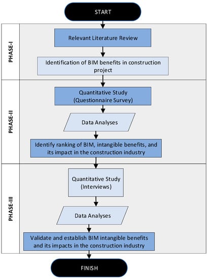 This study aims to establish the intangible benefits of BIM in the construction project (independent variable) and its impacts on the construction processes (dependent variables). Therefore, this study used a mixed method, i.e., quantitative analysis and qualitative analysis, as this can provide stronger evidence for a conclusion because the methods may validate each other. Moreover, the strength of one method can be used to overcome the weakness of the other method. Data collected and analysed for this study went through a three-phase research design. Every phase had its procedure and justification before the next phase began. This phase was important as a guide for the research method.