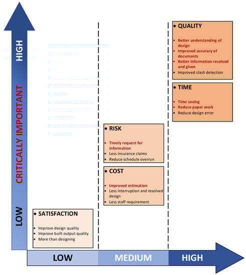 25]. Therefore, the reported benefits of BIM can be suggested to be categorized into objectives of quality, time cost, safety and legal, which are related to the capabilities of BIM.