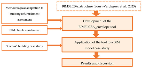 The tool’s development took previous development [31] into consideration to conduct building structure evaluation based on the LCSA in BIM. The procedure to adapt the BIM3LCA_structure tool to the envelope building system consisted of a methodological adaptation of the LCSA to building refurbishment assessment and BIM-Object library enrichment. The methodological adaptation aimed to include the detected particularities to apply the LCSA to building refurbishment, as described in [26]. The BIM-LCSA implementation was based on the enrichment of the properties of the building elements that composed the BIM model (such as walls, windows, doors, etc.), using information extracted from a database (the so-called BIM-TBL database).
