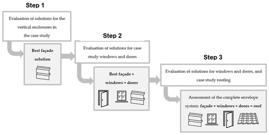 Step 2: Comparison of solutions for windows and doors in the case study, whereby the best solution is determined and adopted for the evaluation of the last element. For this purpose, three types of carpentry were considered for the windows, two solutions for the exterior doors (steel and aluminium), and a combination of both solutions (see Table 2 and Table 3).