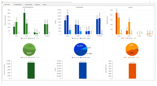 The results show that the triple-dimension assessment (environmental, economic, and social) of the building envelope refurbishment could be conducted in real-time using a BIM model. The tool enabled the comparison of various materials and technical solutions in real-time, enabling the logical and orderly organisation of the evaluation of the elements that comprised the building envelope, thereby facilitating the calculation of the LCSA. However, the normalisation of the results and the weighting of the three dimensions (environmental, economic, and social) was manually implemented.