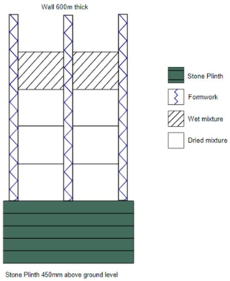 A cohesive mixture was obtained by distributing and layering the materials evenly and then trampling on the mixture by foot []. The rammed earth construction method is highly dependent on the amount of water used in the mixture. Excessive amounts of water make the mixture too soft and difficult to use, requiring several days of drying time. Conversely, inadequate water makes the mixture challenging to compact and prone to crumbling. After the mixing process, the material is compacted to create building walls, with a typical thickness of around 600 mm []. This thickness is largely responsible for the strength of the structure, as the compressive strength of the cob is relatively low []. Typically, cob walls are built off stone plinths, varying from 450 mm above ground level to the first floor in domestic buildings.