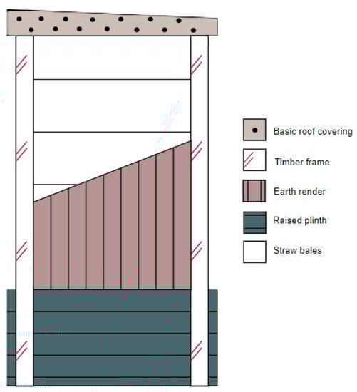 Depending on the type of straw used in construction, there may be varying results, similar to RE construction. Rice-straw bales, for instance, did not align in the same direction as previous bales, leading to the development of rods and pins for structural purposes []. The performance of straw can also be affected by whether it is halophytic (salt-tolerant) or not, as it is hygroscopic and requires specific attention when rendering. The load-bearing walls are constructed by stacking straw bales in rows on a raised plinth, usually within a timber frame, and then plastering with earth render. A basic roof can be constructed using a timber skeleton to protect the bales from weathering damage. Exposing the straw defeats the purpose of any roof covering, while the render provides a degree of fire resistance. The compressed bales are much less of a fire risk than loose straw on site. Like wood, the charring of the outer layer during a fire further slows the decomposition and helps protect the structural integrity []. Pest infestations are not usually an issue and do not affect the durability of the structure, but the moisture content can have a direct impact on longevity. Any moisture content over 25% for an extended period can lead to wall deterioration, while continuous wet and dry cycles are manageable as long as the structure can breathe. However, this raises questions about the method’s suitability in areas with high humidity [].