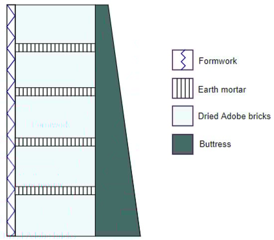 Adobe bricks, traditionally produced in the summer months, are created by combining clay soil with straw or other fibrous materials []. The mixture is then placed into timber-cast moulds and left to naturally dry out in the sun. After the drying stage, the adobe bricks can be layered on top of each other using an earthen mortar. To ensure stability is maintained, buttresses are often installed throughout many adobe structures. In the past, earthen mortars were the only option available. Once the dwelling is completed, a final coat of render is applied to protect it from weathering effects. The durability of the bricks is testified to by the fact that these buildings have lasted hundreds of years. This is dependent upon the maintenance and environment they are located in. Rain erosion is the main risk, and extended periods of rain can jeopardise the integrity of the walls [].