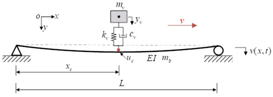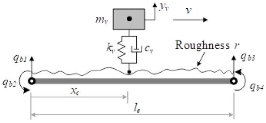 A vehicle–bridge interaction (VBI) element with road surface roughness r was used, illustrated in Figure 3. The test vehicle is modelled as a sprung mass supported by a spring of stiffness and a dashpot of damping coefficient . The coordinate represents the position of the contact point in the element local coordinate. The equation of motion for the VBI element can be expressed as: