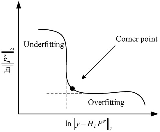 The L-curve principle is employed to obtain the optimal solution and to identify the optimal regular parameter . As a raph-based parameter selection method, the L-curve principle involves plotting two quantities, the solution norm (y axis) and the residual norm (x axis), on the logarithmic coordinate scale to find the equilibrium point, illustrated in Figure 2. At the corner point of the L-curve, both the solution norm and the residual norm are maintained in a balanced dynamic equilibrium, indicating that the point represents the optimal regularisation parameter value.