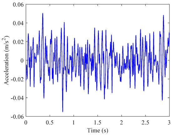 In order to authenticate the reliability of the proposed method, a numerical verification is conducted within this section. This is achieved by employing the identification procedure delineated in Section 5. The contact response, obtained through numerical calculation, is taken as the real value, whereas the contact response identified in reverse is taken as the predicted one. The accuracy of the proposed method is verified by comparing these two values. The properties of the vehicle and bridge are listed in Table 1. The vehicle traverses the bridge at a constant speed of 10 m/s. A random road roughness sample with Grade A is generated based on the ISO 8606 specification, with the simulated road roughness sample illustrated in Figure 4. It is assumed that the vehicle maintains a zero initial state, with a step size of 0.001 s adopted for the numerical calculation. Employing the vehicle and bridge parameters as listed in Table 1, the vehicle acceleration response is demonstrated in Figure 5.