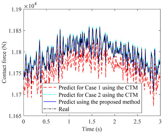 Figure 7 depicts the comparison results of the moving contact force for various identified methods. It can be observed that the contact force identified using the proposed method coincides closely with Case 2 using the CTM and the real values, whereas a distinct disparity is observed with the prediction result of Case 1. In comparison with the CTM, the proposed method utilises fewer sensors to obtain the moving contact force with high precision. However, a greater number of sensors must be adopted to ensure the identification accuracy of the CTM. Consequently, the comparison results further validate the accuracy and advantages of the proposed method.